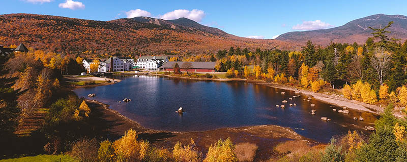 Rolling mountains descend in a rush of color in the heart of Waterville Valley, whose peak foliage is typically seen between the last week of September and the first week of October.