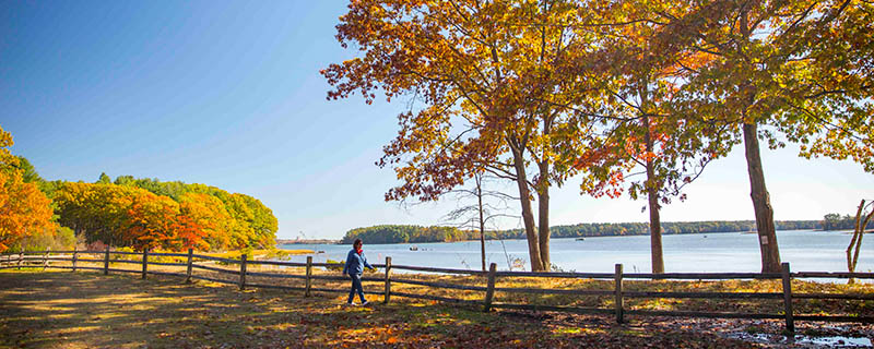This preserved farm protects scenic vistas and beautiful wide-open spaces on the banks of the Oyster River, where illuminating gold, auburn, and rouge leaves light up the scenery near the last week of October.