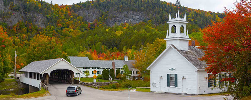 The Stark Covered Bridge evokes a classic fall feel, where a historic covered bridge and white steepled church take on a captivating autumn glow during the last week of September and first week of October.