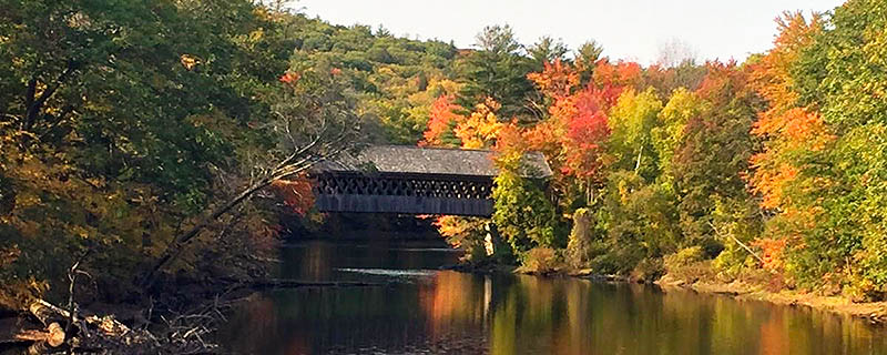 During the last weeks of October, the Henniker Covered Bridge becomes framed in a blaze of orange and auburn colored leaves, delivering a classic New England sight over the Contoocook River.