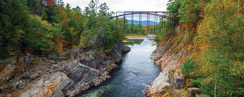 Among the ruins of a former pulp mill on the banks of the Pemigewassett River, you’ll find this hidden spot decked in vibrant orange, gold, and red leaves come the second and third week of October.