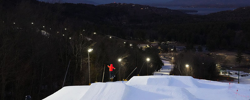 Whether you're seeking peaceful night runs or adrenaline-pumping park sessions, Gunstock Mountain Resort offers an exciting winter experience after dark. Home to one of the Northeast’s largest lighted terrain parks, Blundersmoke, the resort provides a thrilling challenge for freestyle skiers and snowboarders. Night skiing and riding begins at 3 PM, so consider heading to the summit for breathtaking views the first hour of your evening adventure. For even more fun, Gunstock’s illuminated tubing hill offers an additional way to enjoy the mountain at night.