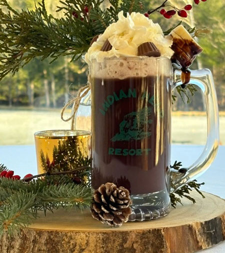 Introducing the No Show Shoe, at Indian Head Resort, a delicious winter warm-up that embodies indulgence! This decadent cocktail is a perfect blend of hot cocoa, Skrewball Peanut Butter Whiskey, Banana Liqueur, and Simply Chocolate Liqueur—creating a rich, creamy, and utterly irresistible drink that’s perfect for winter. As if that weren't enough, it’s topped off with a garnish of peanut butter cups and chocolate-dipped bananas, giving you that extra touch of dessert-like bliss in every sip.