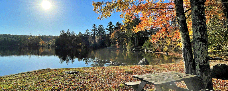 Wrap up your day with a visit to Wadleigh State Park. One of the lesser-known State Parks, it’s a great find! Located on the southeastern shores of Kezar Lake it’s quiet and peaceful. Walk amid the tall pines and hemlocks and enjoy the calming sounds of the lake water. There’s a 3-mile loop that takes off from the park and goes around the shore of the lake. It follows mostly dirt roads and offers fantastic lakeside views and fall foliage too. If you’d rather, you can drive thr route too, just follow Keyser Street to Kings Hill Road, to Penacook Road to Wadleigh Hill Road.