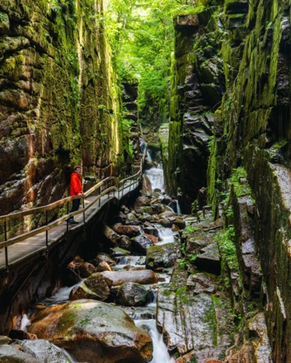 Once you enter the gorge, you’ll walk down to the Flume Covered Bridge and past the main gorge. You’ll head up some steps and come across the beautiful Avalanche Falls toward the end of the boardwalk. Stop and bask in the glory of the falls and make sure to bring your camera.