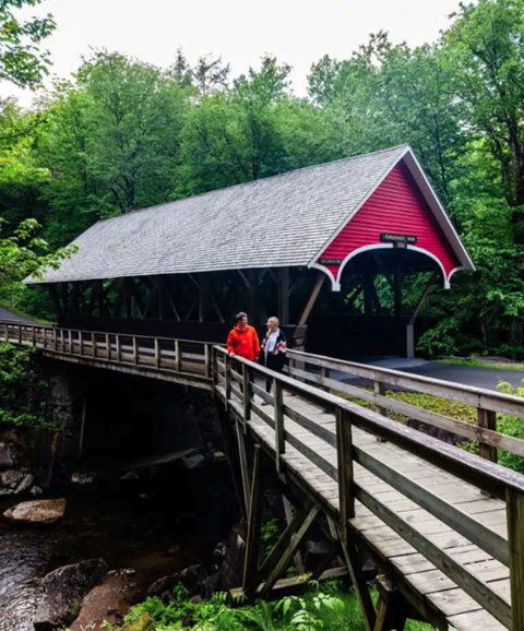 Before heading out of the White Mountains, no trip to New Hampshire is complete without visiting the famous Flume Gorge! The main attraction at Flume Gorge is the 2-mile self-guided trail that takes you through the gorge itself. As you walk along the boardwalks and stairs, you'll encounter a series of captivating sights, including towering granite walls, rushing waterfalls, and picturesque streams. The trail leads you over covered bridges and through narrow passageways, offering an up-close and personal experience with the gorge's natural beauty. Along the way, you’ll also be able to check out the beautiful Flume Covered Bridge!