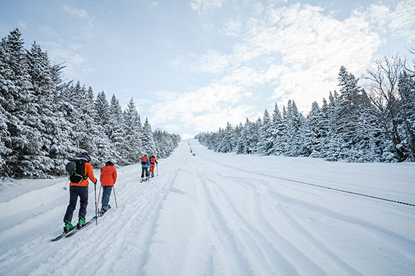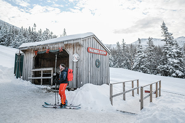 The Cog Railway is best known for taking visitors from Marshfield Base Station up to the summit of Mt. Washington. But, in the winter, skiers and split boarders can also ski uphill alongside the train track, as far as they’d like (including up to the summit of Mt. Washington) and then ski or board back down to Marshfield Base Station. The difficulty level of this tour is intermediate, and anyone venturing above treeline who does not plan to follow the Cog Railway down (and wants to instead drop into one of the many ski lines off of Mt. Washington) should have both avalanche education training as well as avalanche safety tools (like a beacon, shovel, and probe).